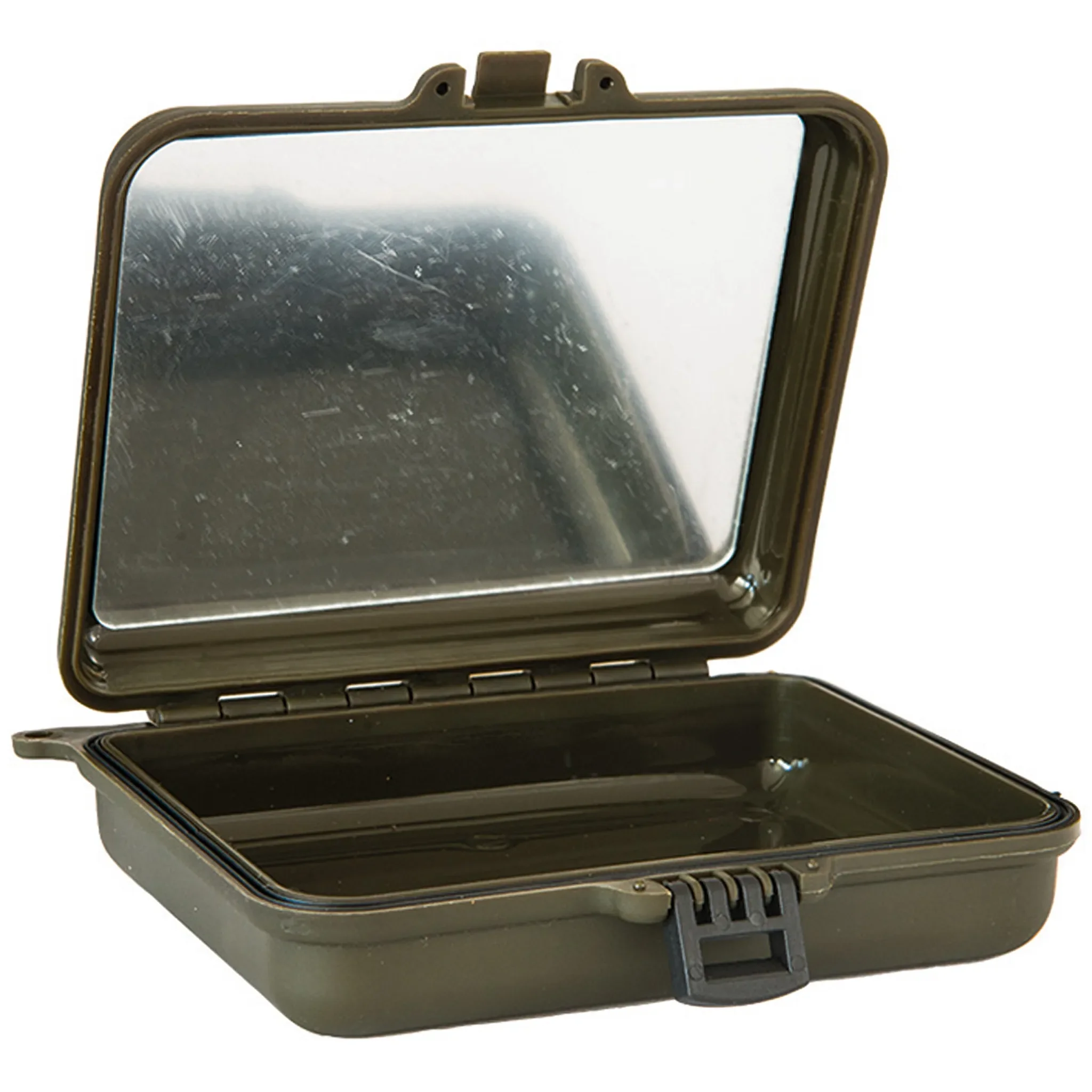 Ein integrierter Spiegel im Deckel kann in Notsituationen als Signalspiegel dienen. Zusätzlich verfügt die Box über eine Öse zur Befestigung einer Kordel, sodass sie bequem am Rucksack oder an der Ausrüstung fixiert werden kann.