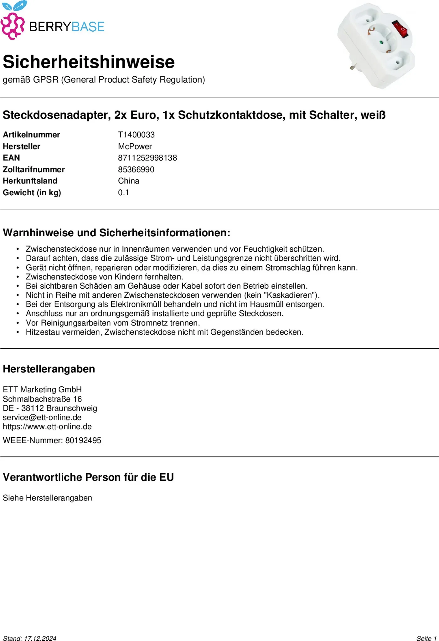 | Lieferumfang | 1× Steckdosenadapter |